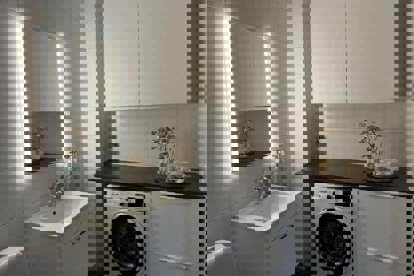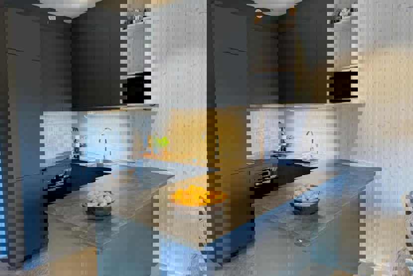 Køkkenet indeholder: elkomfur med ovn, køleskab, frys, opvaskemaskine, microovn.