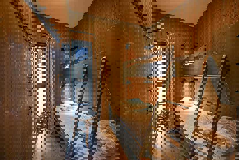 Soveværelse-1= 1 dobbeltseng 160 cm bred. Soveværelse-2= 1 køyeseng med 120 cm bred underkøye og 80 cm bred overkøye.