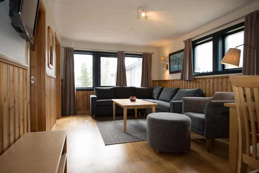 Opholdsstue med køkkenafdeling. TV, tørreskab, rum til skiudstyr, udeplads (skovles ikke).