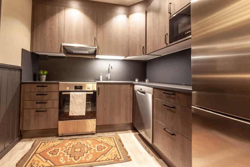 Køkkenet indeholder: elkomfur med ovn, køleskab, frys, opvaskemaskine, microovn.