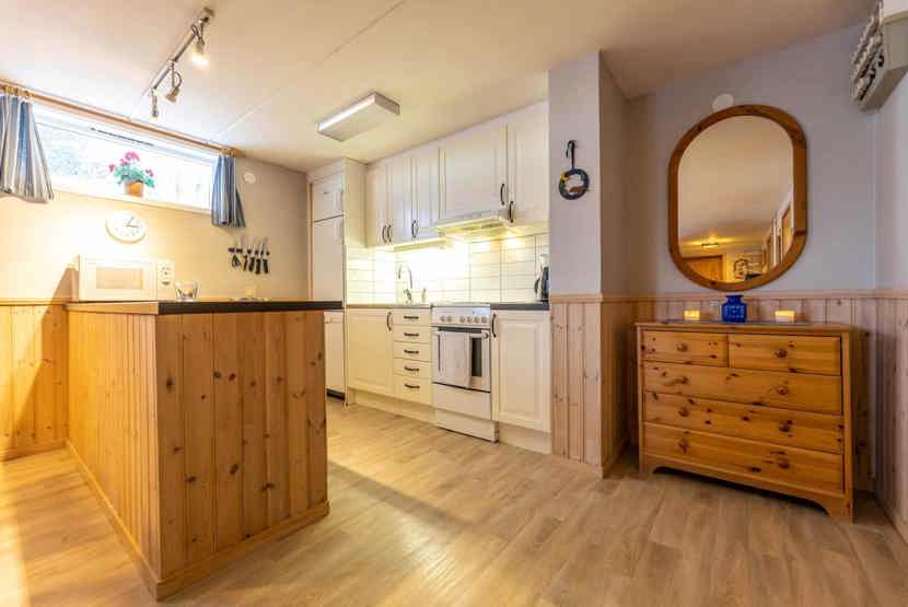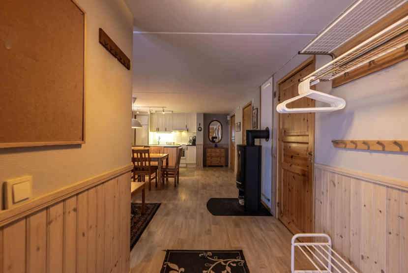 Opholdsstue med køkkenafdeling. TV, brændeovn (brænde indgår ikke), tørreskab, rum til skiudstyr.