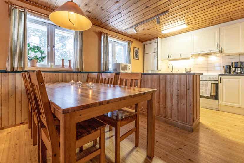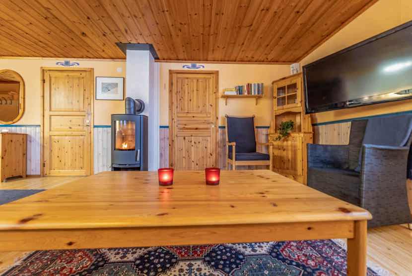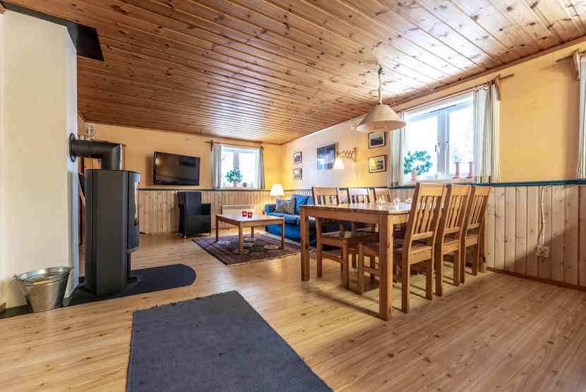 Opholdsstue med køkkenafdeling. TV, brændeovn (brænde indgår ikke), tørreskab, rum til skiudstyr.