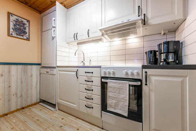 Køkkenet indeholder: elkomfur med 3 plader og ovn, køleskab, opvaskemaskine, microovn.