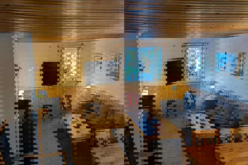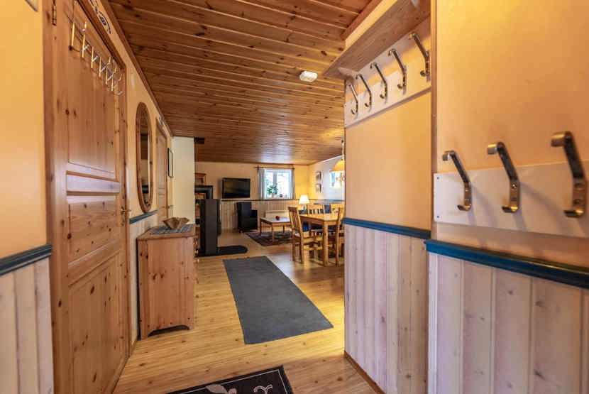 Opholdsstue med køkkenafdeling. TV, brændeovn (brænde indgår ikke), tørreskab, rum til skiudstyr.