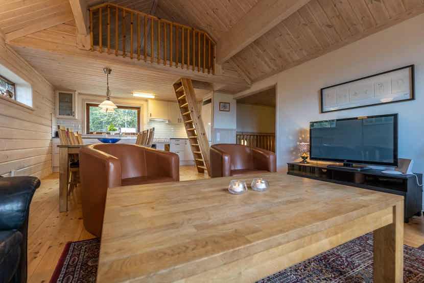 Opholdsstue med køkkenafdeling. TV, åben pejs (brænde indgår ikke), tørreskab, altan (skovles ikke), rum til skiudstyr.