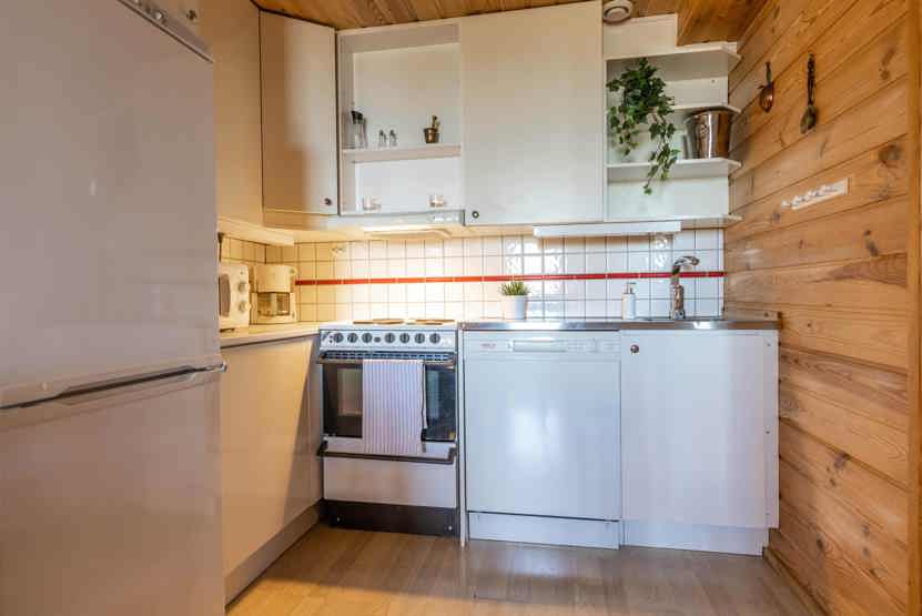 Køkkenet indeholder: elkomfur med ovn, køleskab, frys, opvaskemaskine, microovn.