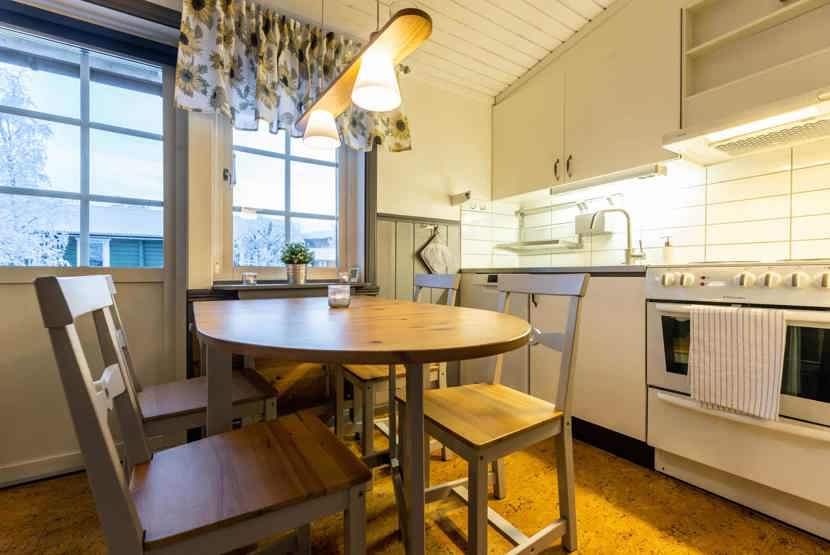 Køkkenet indeholder: elkomfur med ovn, køleskab, frys, opvaskemaskine, microovn.