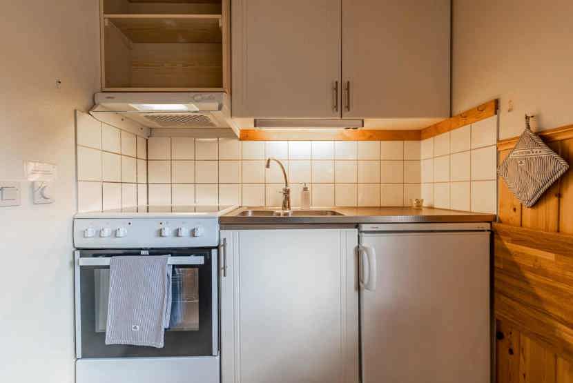 Køkkenet indeholder: elkomfur med ovn, køleskab, frys, opvaskemaskine, microovn.