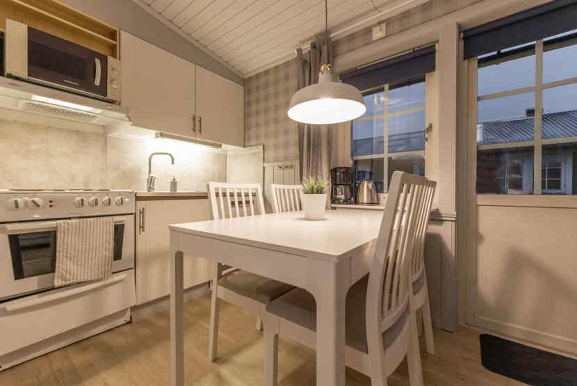 Køkkenet indeholder: elkomfur med ovn, køleskab, frys, microovn, opvaskemaskine.