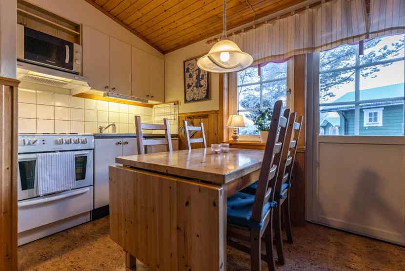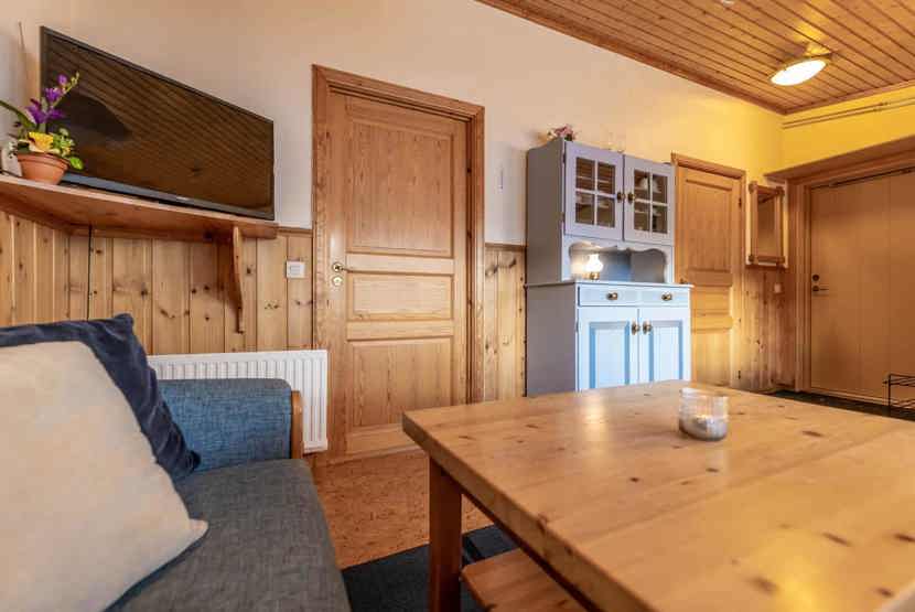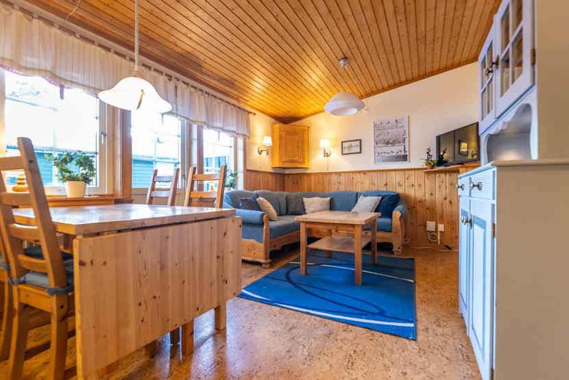 Opholdsstue med køkkenafdeling. TV, tørreskab, rum til skiudstyr, altan (skovles ikke).