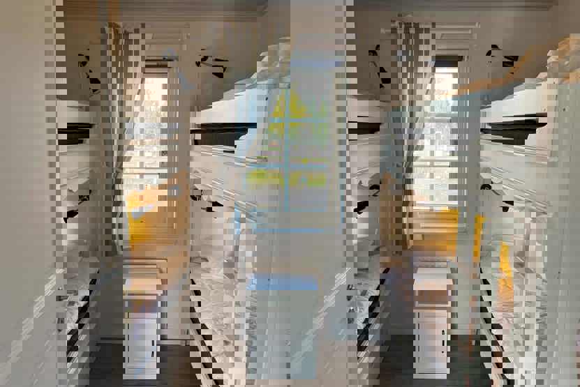 Soveværelse-1= 2 køjesenge hvor både over og underkøje er 80 cm bred.