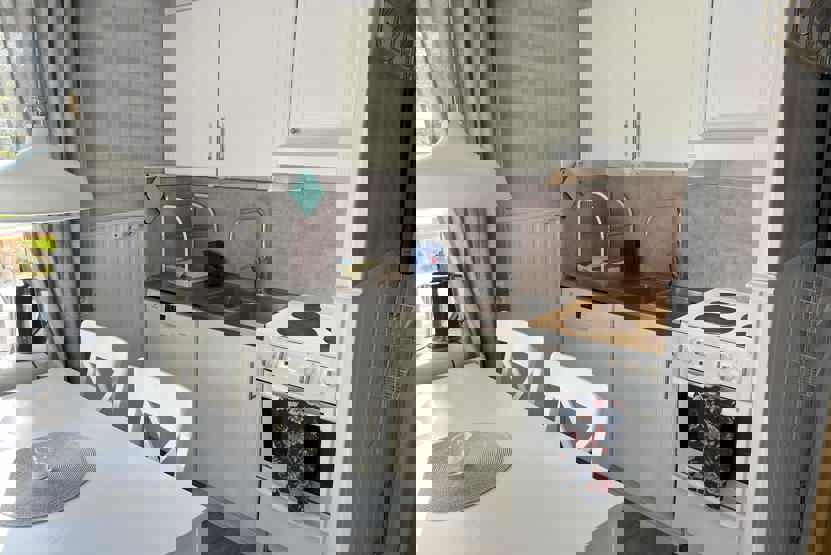 Køkkenet indeholder: elkomfur med ovn, køleskab, frys, microovn, opvaskemaskine.