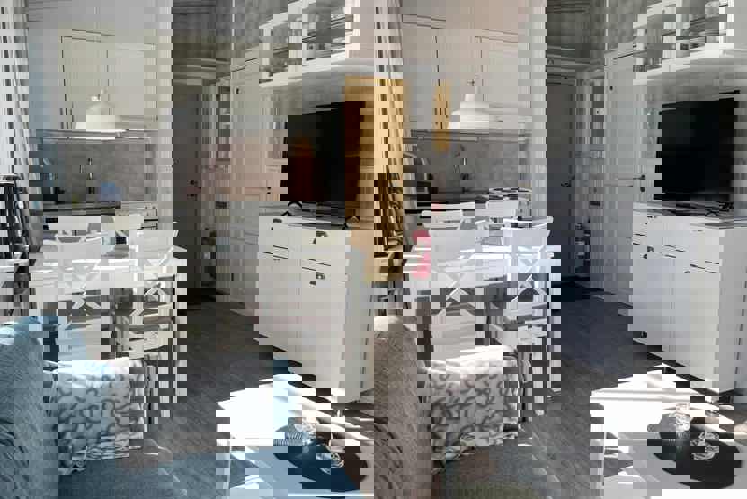 Opholdsstue med køkkenafdeling. TV, tørreskab, rum til skiudstyr, altan (skovles ikke).