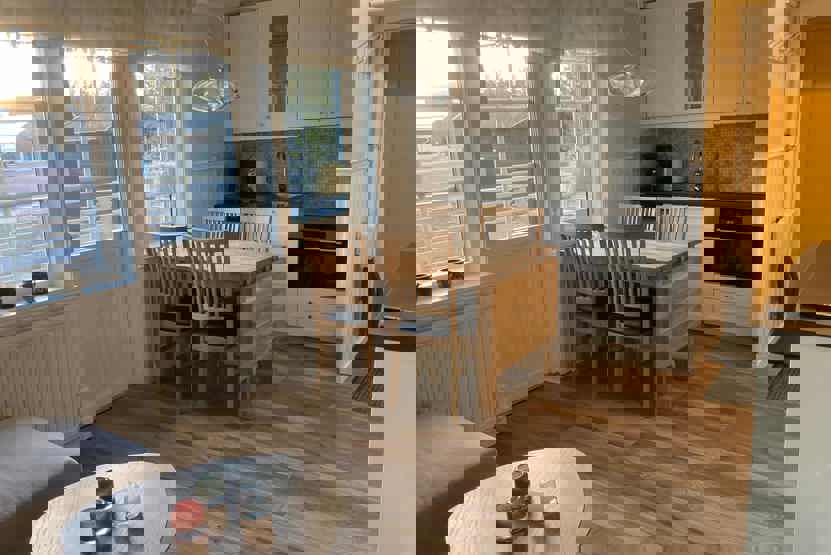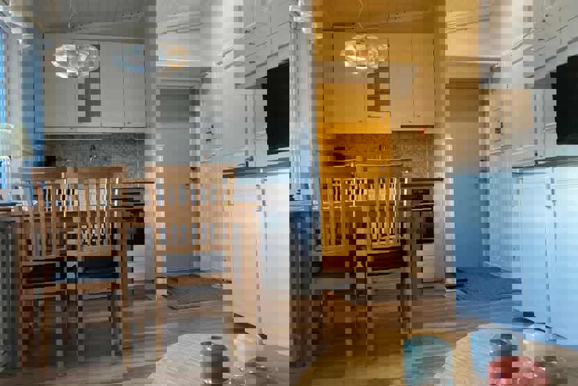 Køkkenet indeholder: kogeplade, kombiugn med microovn, køleskab, frys, opvaskemaskine.