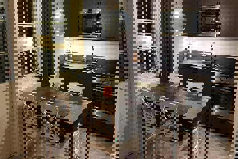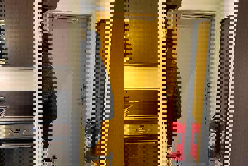 Køkkenet indeholder: elkomfur med ovn, køleskab, frys, opvaskemaskine, microovn.