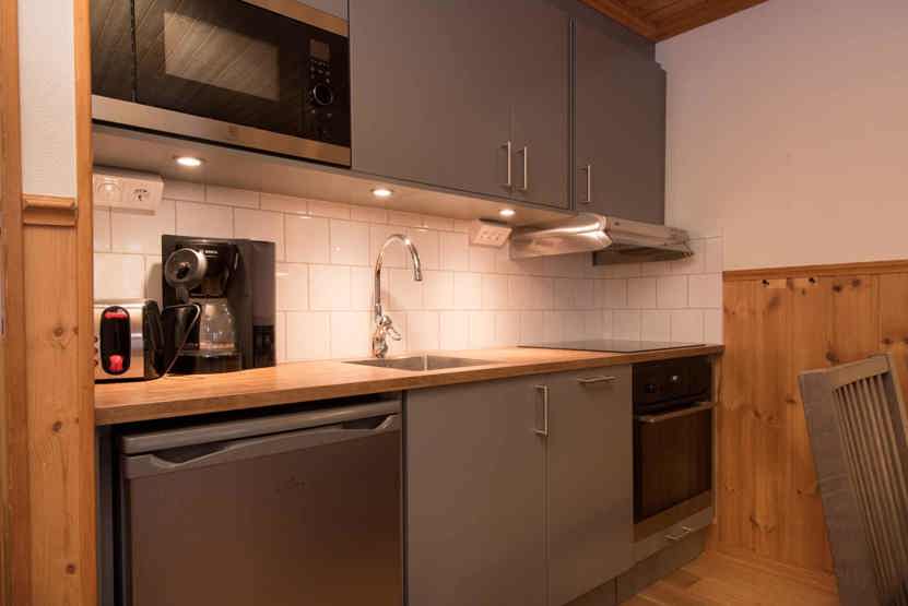 Køkkenet indeholder: elkomfur med ovn, køleskab, opvaskemaskine, microovn.