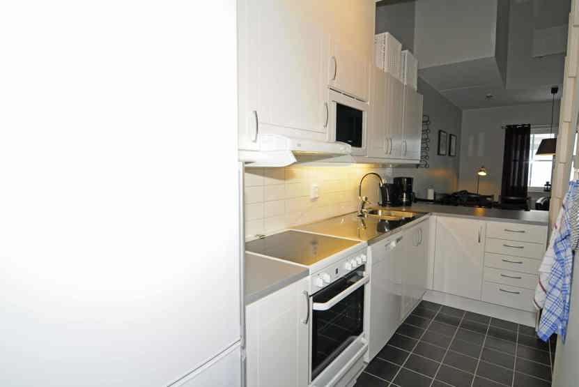 Køkkenet indeholder: keramiske kogeplader med ovn, køleskab, frys, opvaskemaskine, microovn.