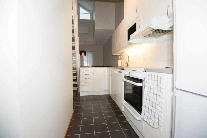 Køkkenet indeholder: keramiske kogeplader med ovn, køleskab, frys, opvaskemaskine, microovn.