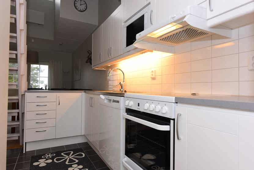 Køkkenet indeholder: elkomfur med ovn, køleskab, frys, opvaskemaskine, microovn.