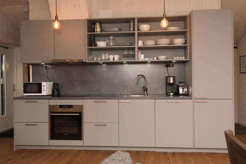 Køkkenet indeholder: keramiske kogeplader, indbygningsovn, køleskab, frys, opvaskemaskine, microovn.