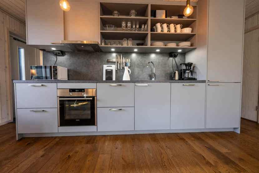 Køkkenet indeholder: keramiske kogeplader, indbygningsovn, køleskab, frys, opvaskemaskine, microovn.