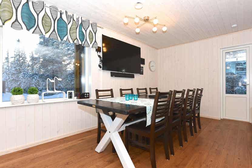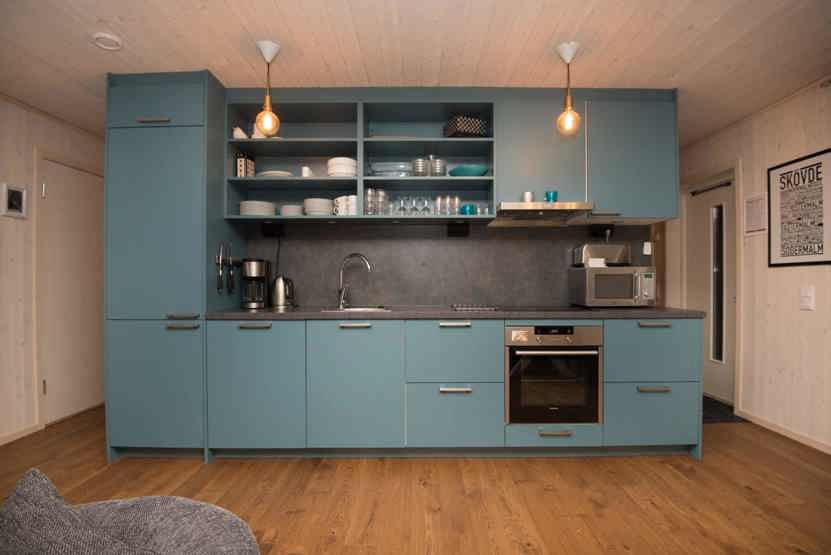 Køkkenet indeholder: keramiske kogeplader, ovn, køleskab, frys, opvaskemaskine, microovn.