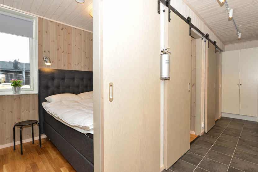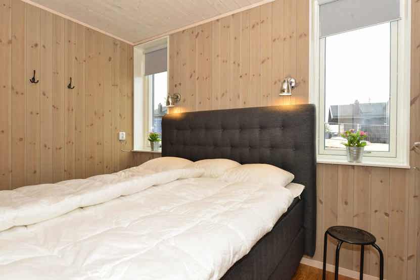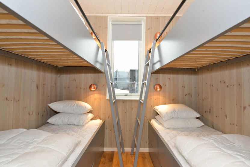 Soveværelse-1= 1 dobbeltseng 160 cm bred. Soveværelse-2= 2 køjesenge 80 cm bred.