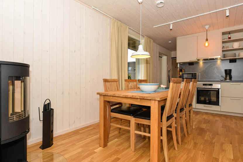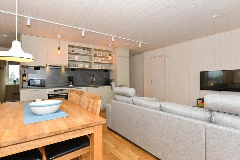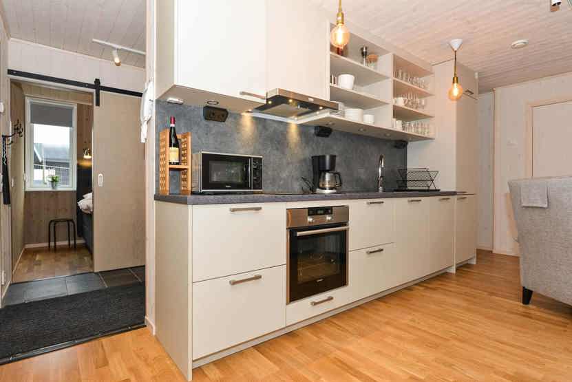 Køkkenet indeholder: keramiske kogeplader, ovn, køleskab, frys, opvaskemaskine, microovn.