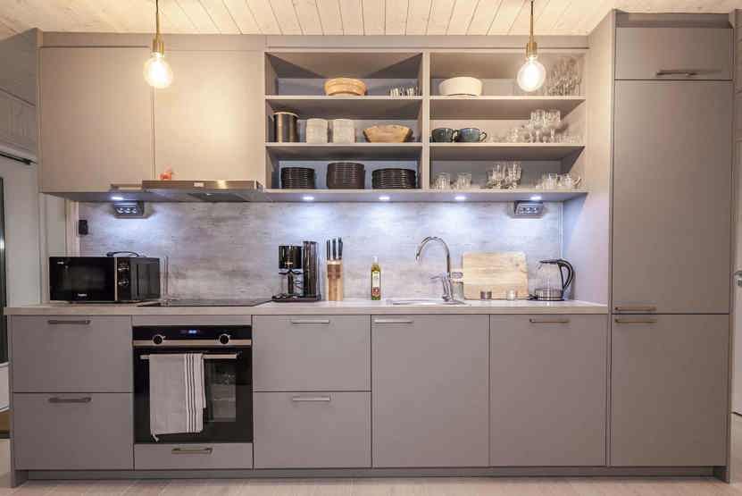 Køkkenet indeholder: keramiske kogeplader, indbygningsovn, køleskab, frys, opvaskemaskine, microovn.