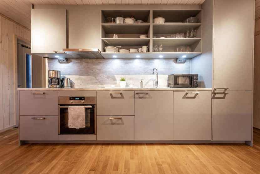 Køkkenet indeholder: elkomfur med ovn, køleskab, frys, opvaskemaskine, microovn.