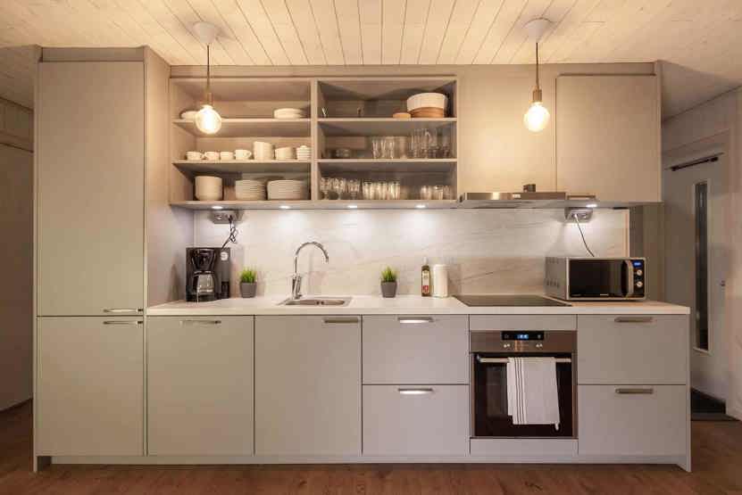 Køkkenet indeholder: keramiske kogeplader, indbygningsovn, køleskab, frys, opvaskemaskine, microovn.