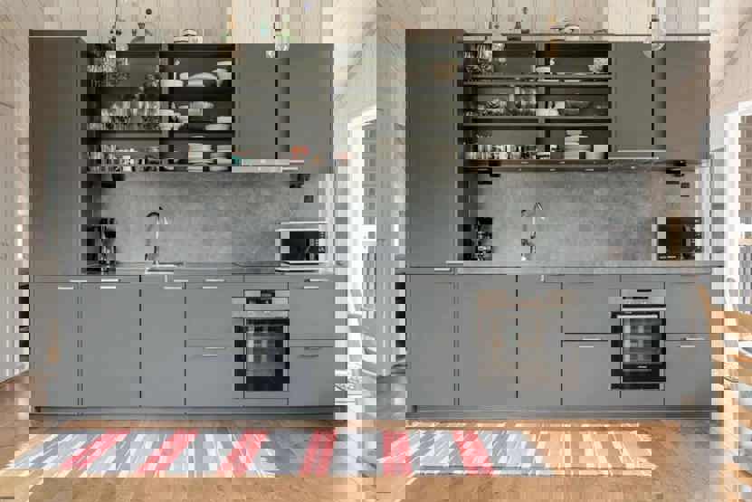Køkkenet indeholder: elkomfur med ovn, køleskab, frys, opvaskemaskine, microovn.