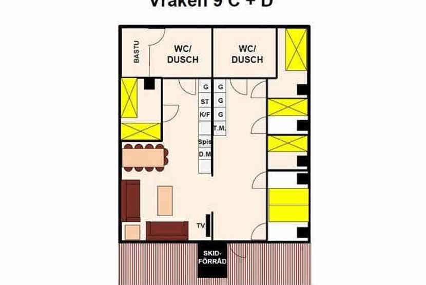 TV, vaskemaskine, tørreskab, 1 barneseng, 1 højstol, rum til skiudstyr, altan (skovles ikke).