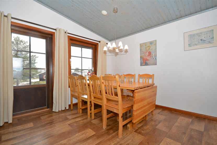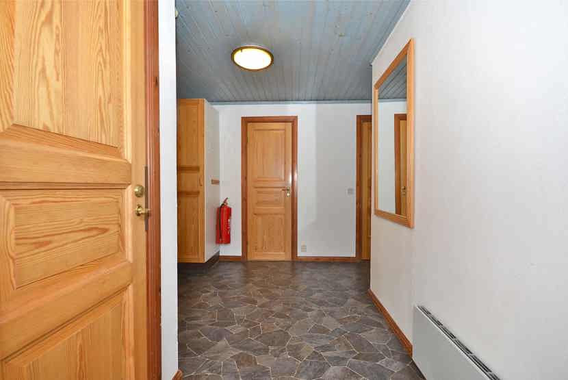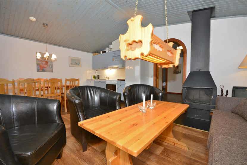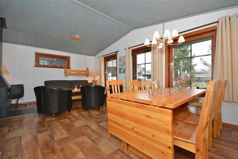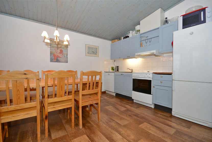 Opholdsstue med køkkenafdeling. TV, brændeovn (brænde indgår ikke), tørreskab, rum til skiudstyr.