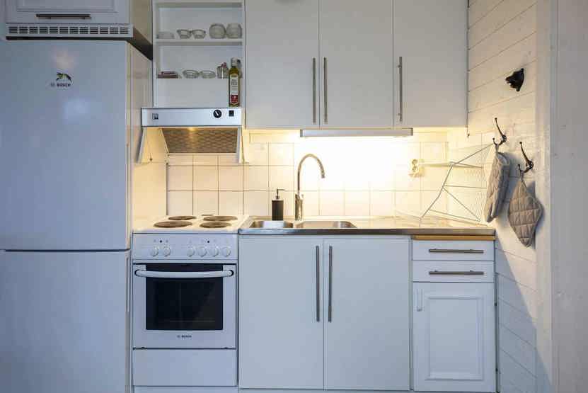 Køkkenet indeholder: elkomfur med ovn, køleskab, frys, microovn.