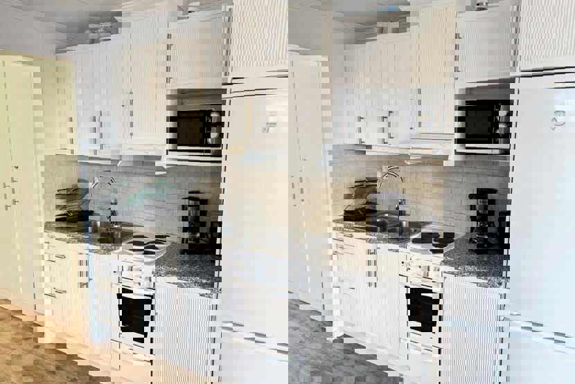 Køkkenet indeholder: elkomfur med ovn, køleskab, frys, microovn.