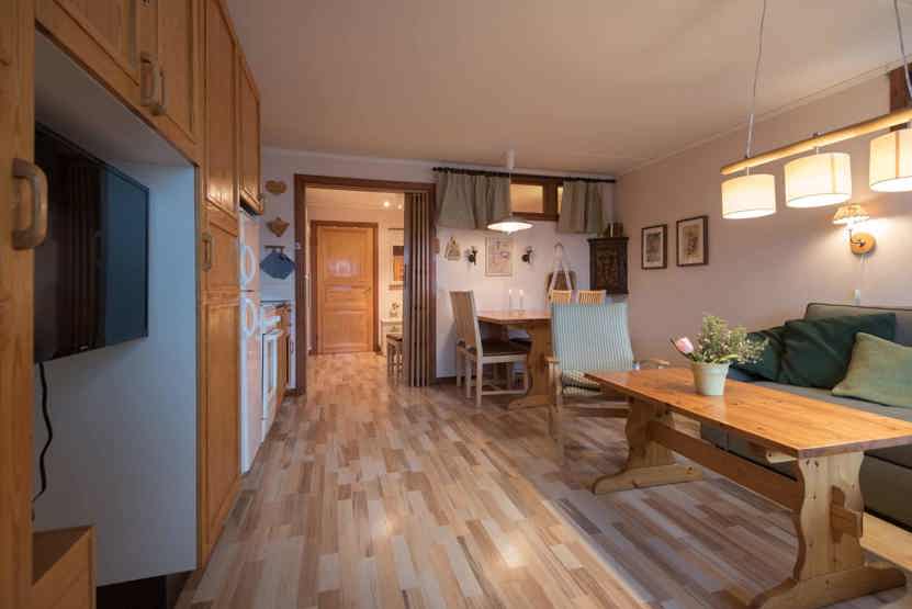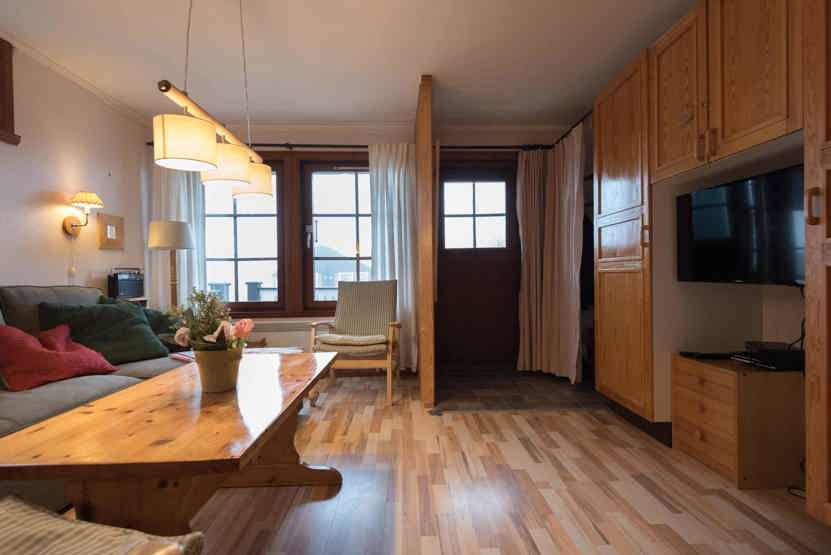 Opholdsstue med køkkenafdeling. TV, tørreskab, rum til skiudstyr, altan (skovles ikke).
