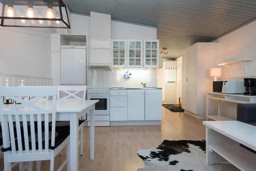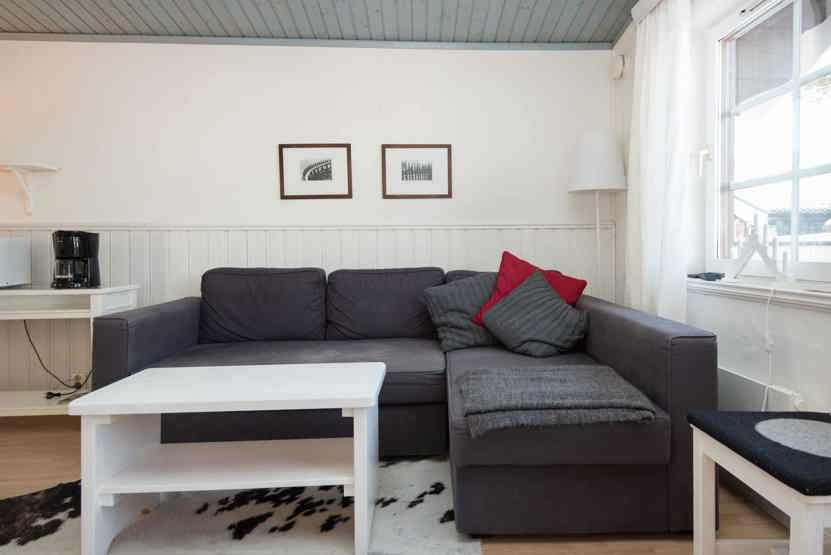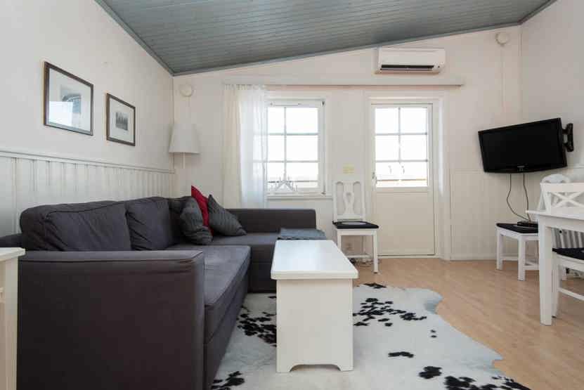 Opholdsstue med køkkenafdeling. TV, tørreskab, vaskemaskine, 1 højstol, balkon, rum til skiudstyr.