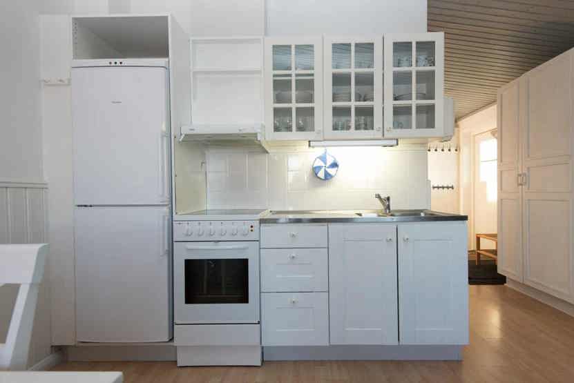 Køkkenet indeholder: elkomfur med ovn, køleskab, frys, microovn.