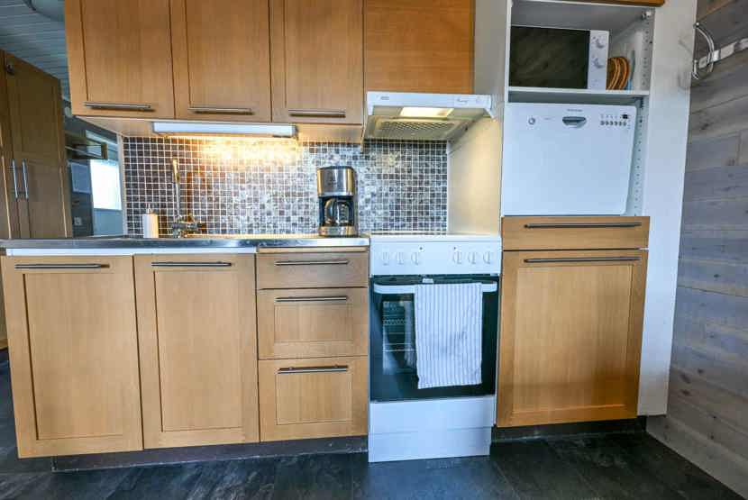 Køkkenet indeholder: elkomfur med ovn, køleskab, frys, microovn, opvaskemaskine.