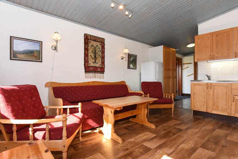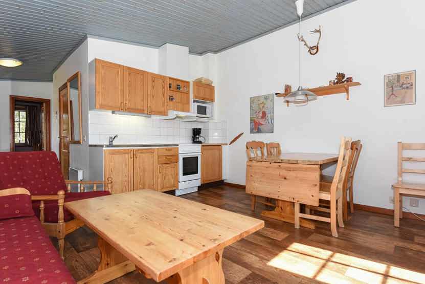 Opholdsstue med køkkenafdeling. TV, tørreskab, rum til skiudstyr, balkon.