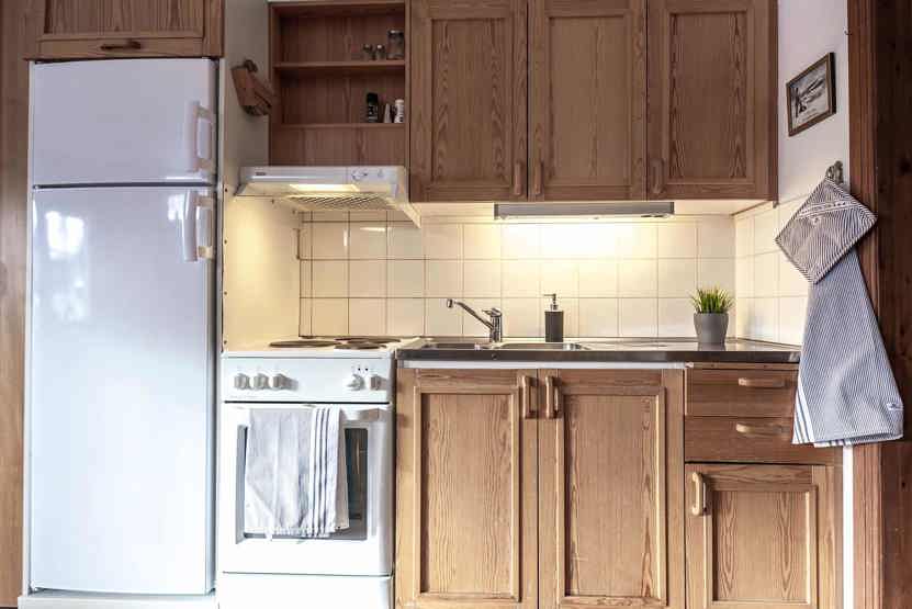 Køkkenet indeholder: elkomfur med ovn, køleskab, frys, microovn.