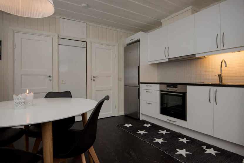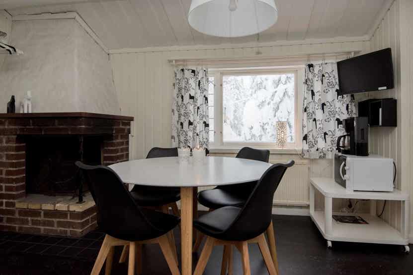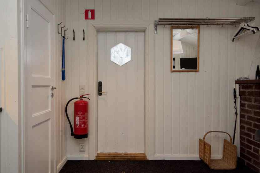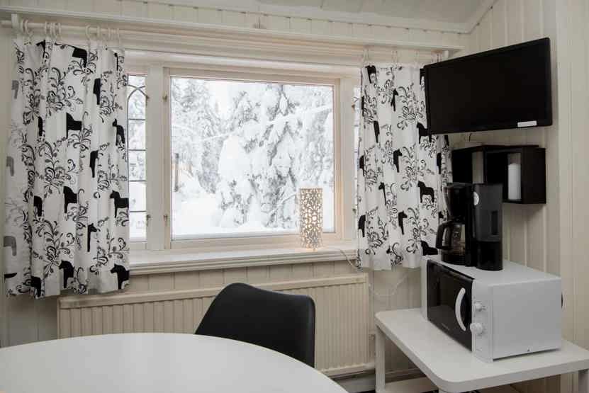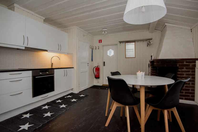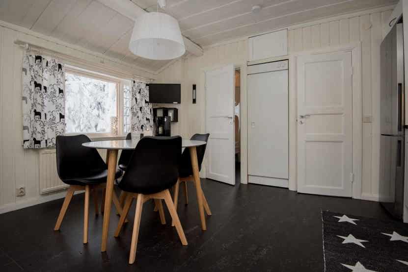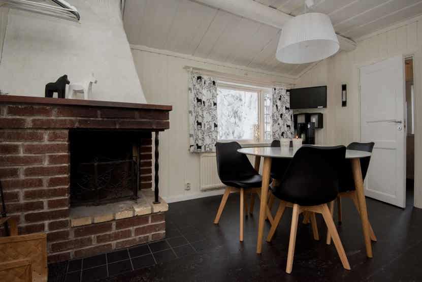 Opholdsstue med køkkenafdeling. TV, åben pejs (brænde indgår ikke), tørreskab, udtag til motorvarmer til bilen forefindes. Kræver specielt stik i bilen.