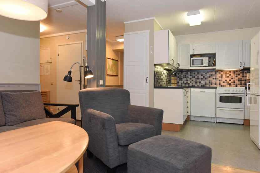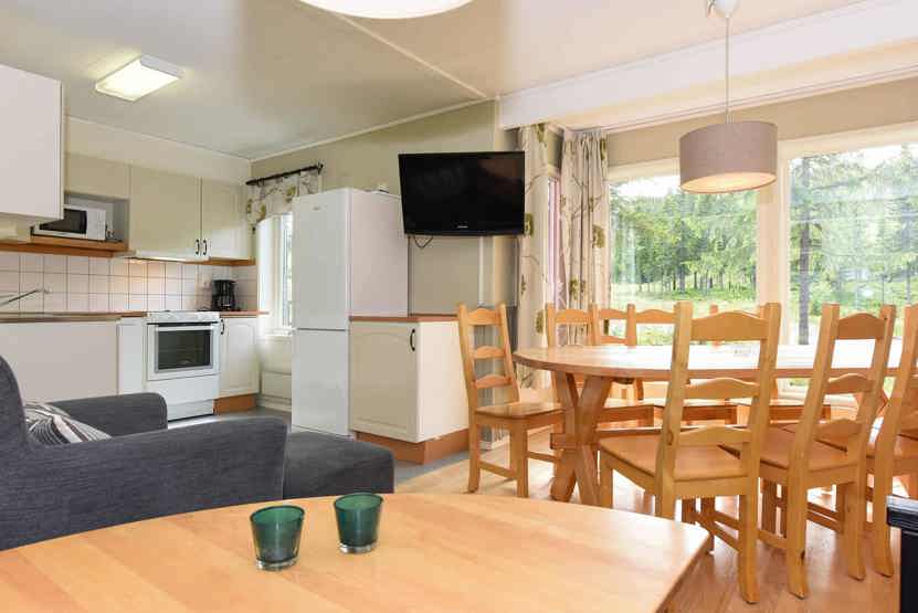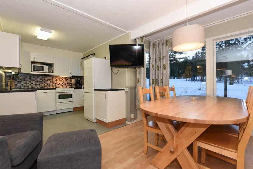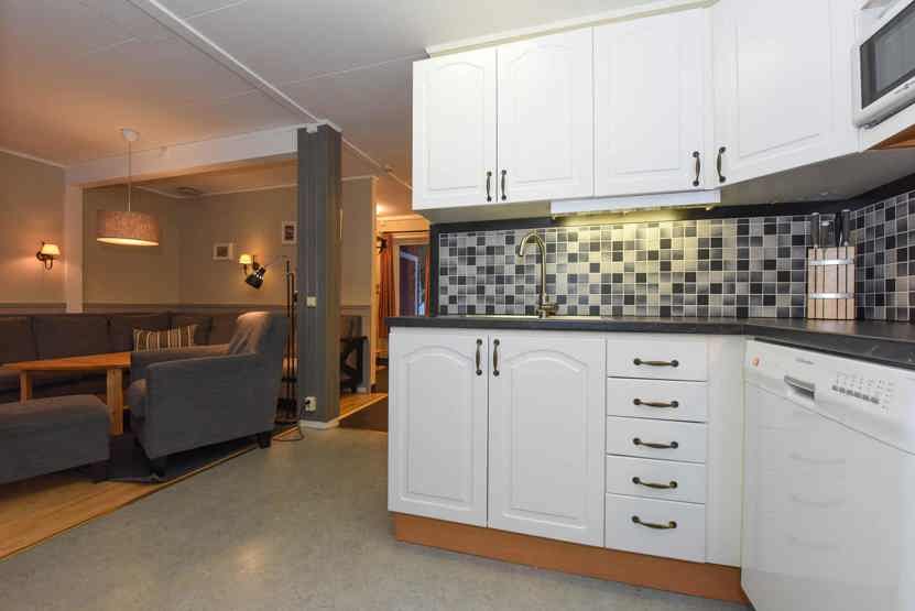 Opholdsstue med køkkenafdeling. TV, tørreskab, rum til skiudstyr.