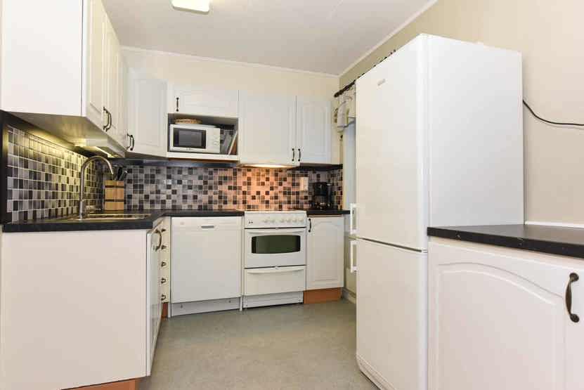 Køkkenet indeholder: elkomfur med ovn, køleskab, frys, microovn, opvaskemaskine.