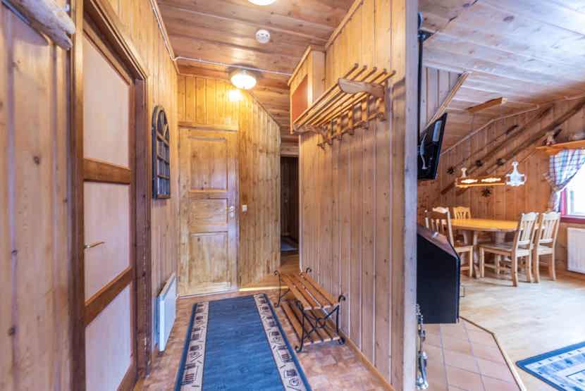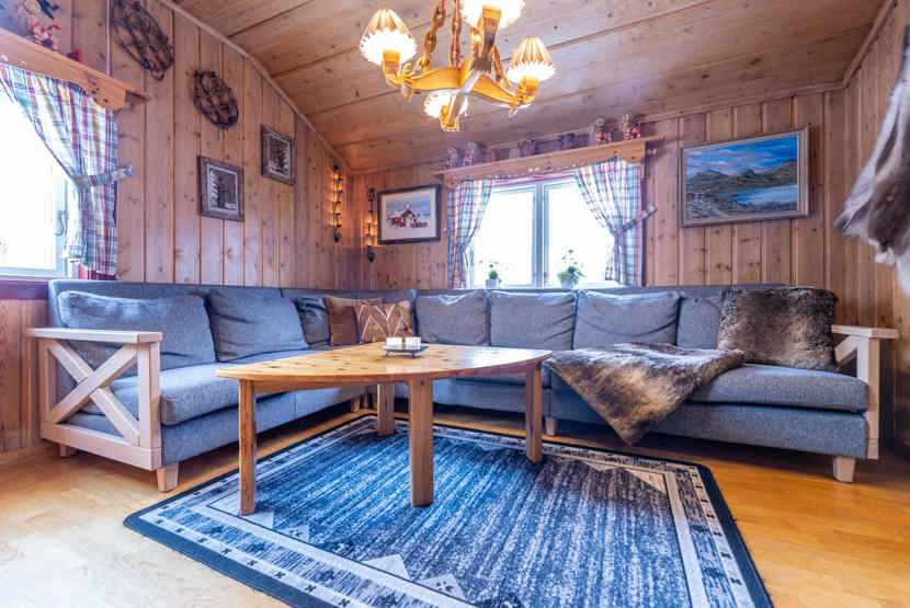 Opholdsstue med køkkenafdeling. TV, brændeovn (brænde indgår ikke), vaskemaskine, tørreskab, rum til skiudstyr.