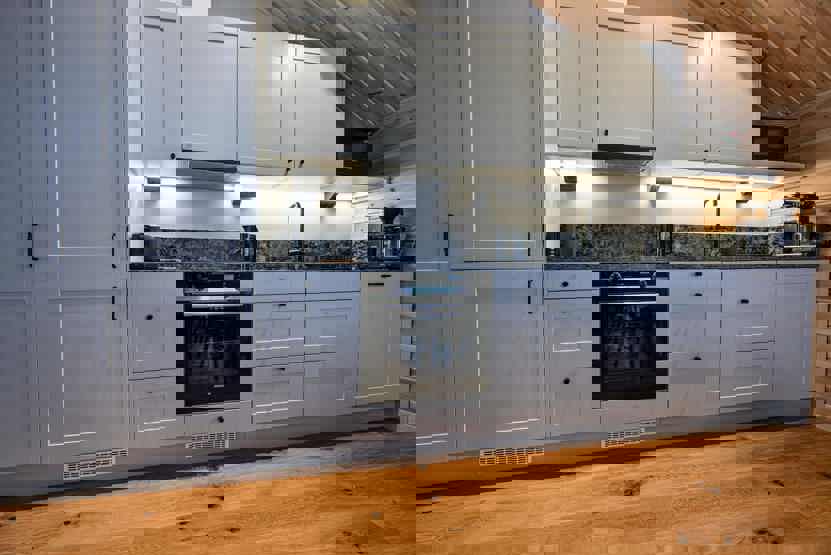 Køkkenet indeholder: keramiske kogeplader, indbygningsovn, køleskab, frys, opvaskemaskine, microovn.