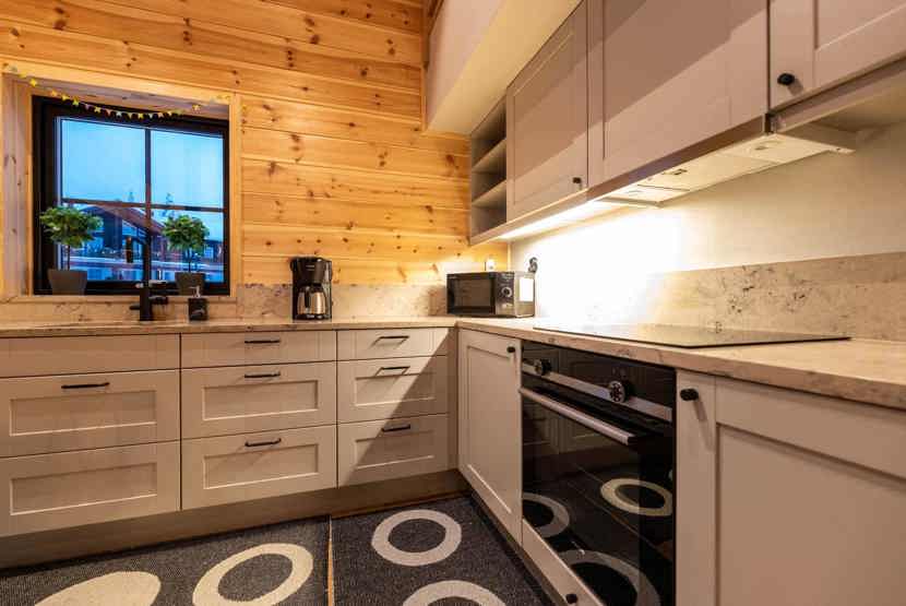 Køkkenet indeholder: elkomfur med ovn, køleskab, frys, opvaskemaskine, microovn.