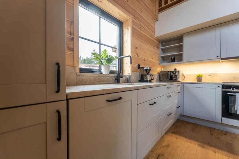 Køkkenet indeholder: keramiske kogeplader, indbygningsovn, køleskab, frys, opvaskemaskine, microovn.