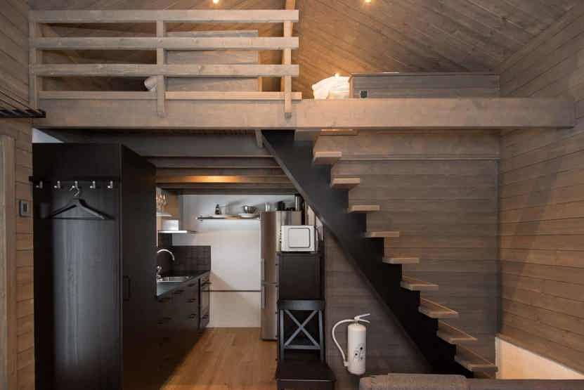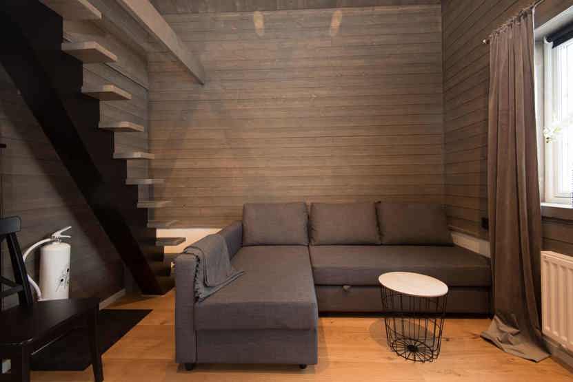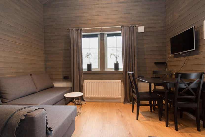 Opholdsstue med køkkenafdeling, sovesofa til 2 personer. TV, rum til skiudstyr.